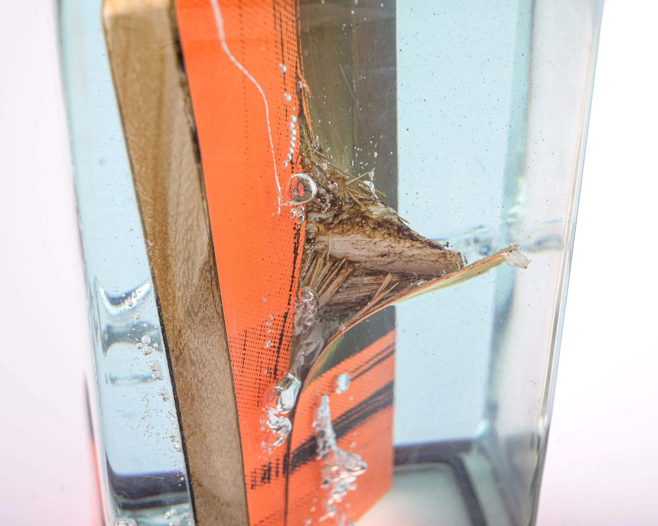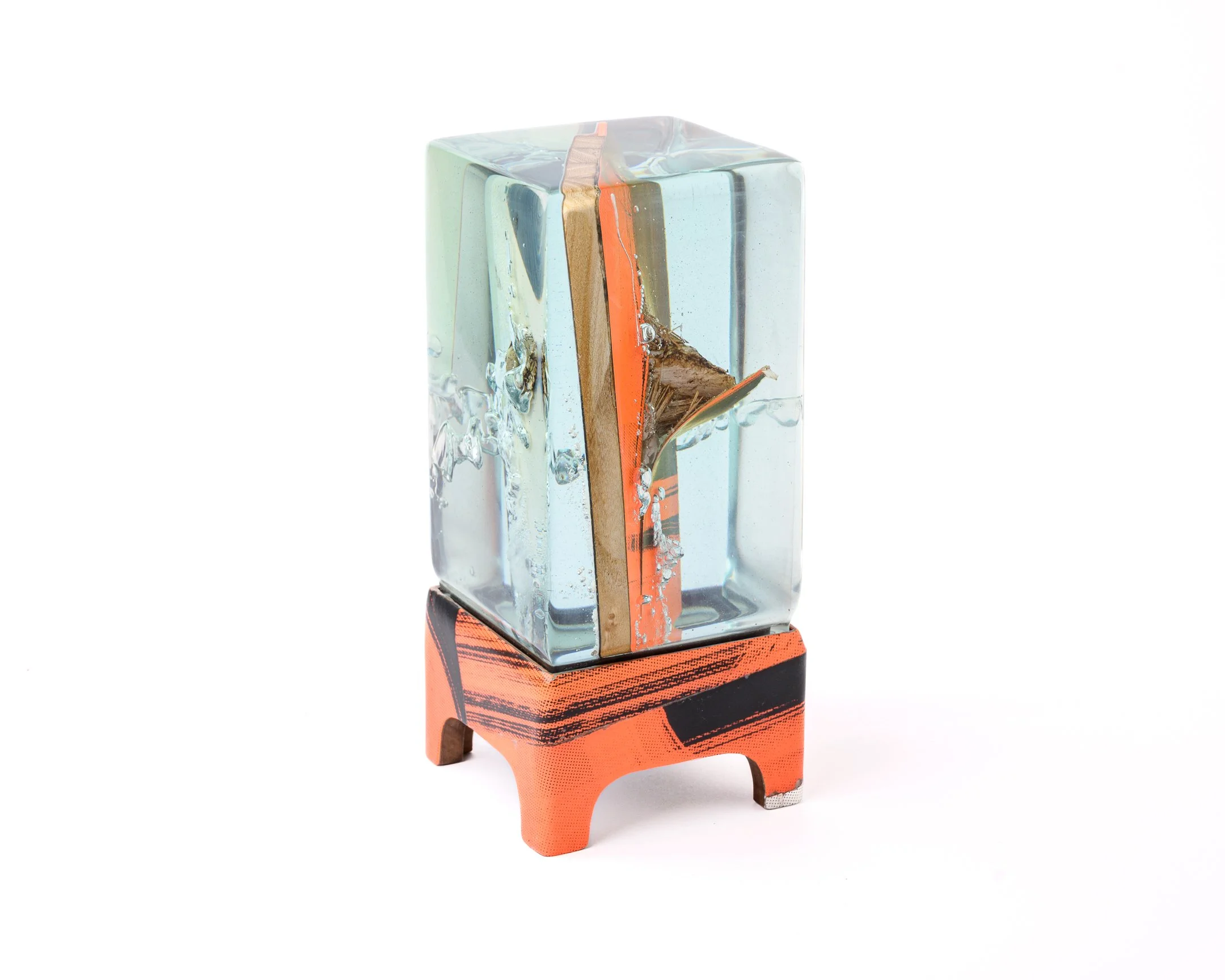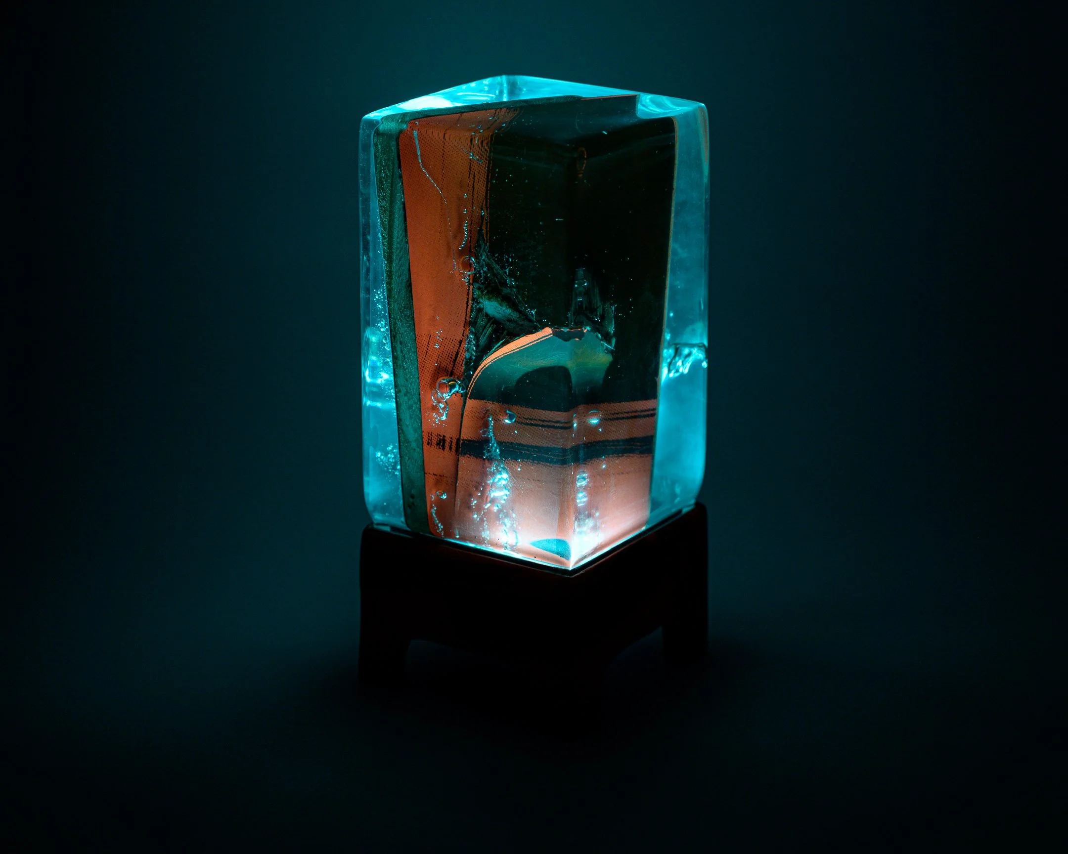 The design captures the dramatic event: air bubbles frozen in resin add a sense of movement and impact, while the lamp base is crafted from the very same board involved in the accident. It's both a tribute and a time capsule — a reminder of resilience, strength, and an unbeatable spirit.