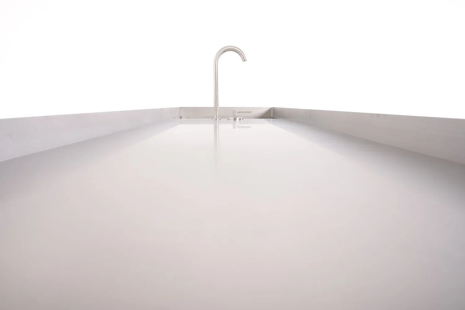 A modern vanity designed for versatile use in commercial lounges, kitchen spaces, and bathrooms. It features a sleek painted MDF exterior, a durable 4mm stainless steel surface, and a base supported by two raw concrete block pillars. An eye-catching piece for contemporary interiors.