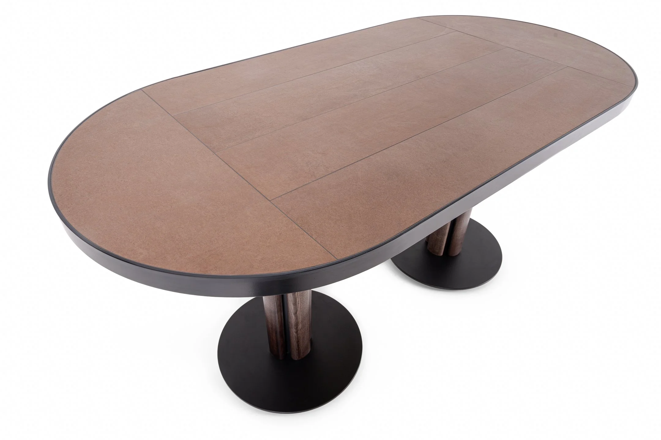 A sleek, contemporary table featuring a tiled top and rounded edges for a refined look. Supported by twin cylindrical legs with circular bases, it balances strength and sophistication. Perfect for modern interiors, it serves equally well as a dining, work, or display table.